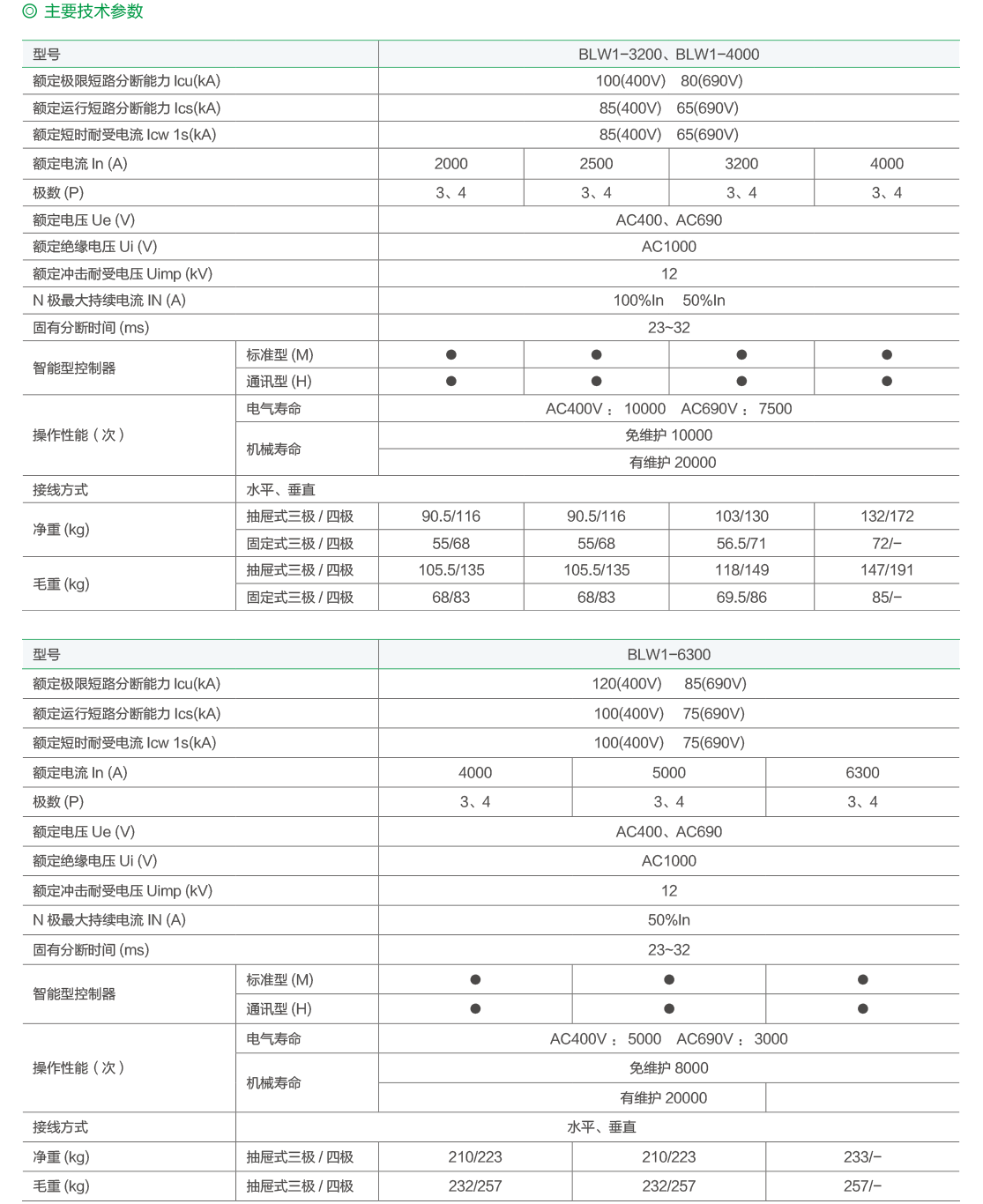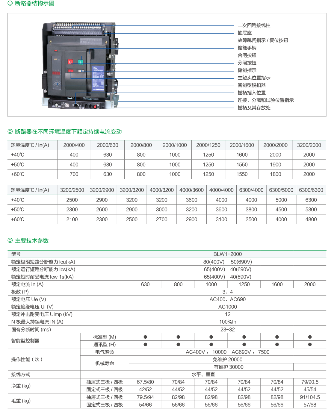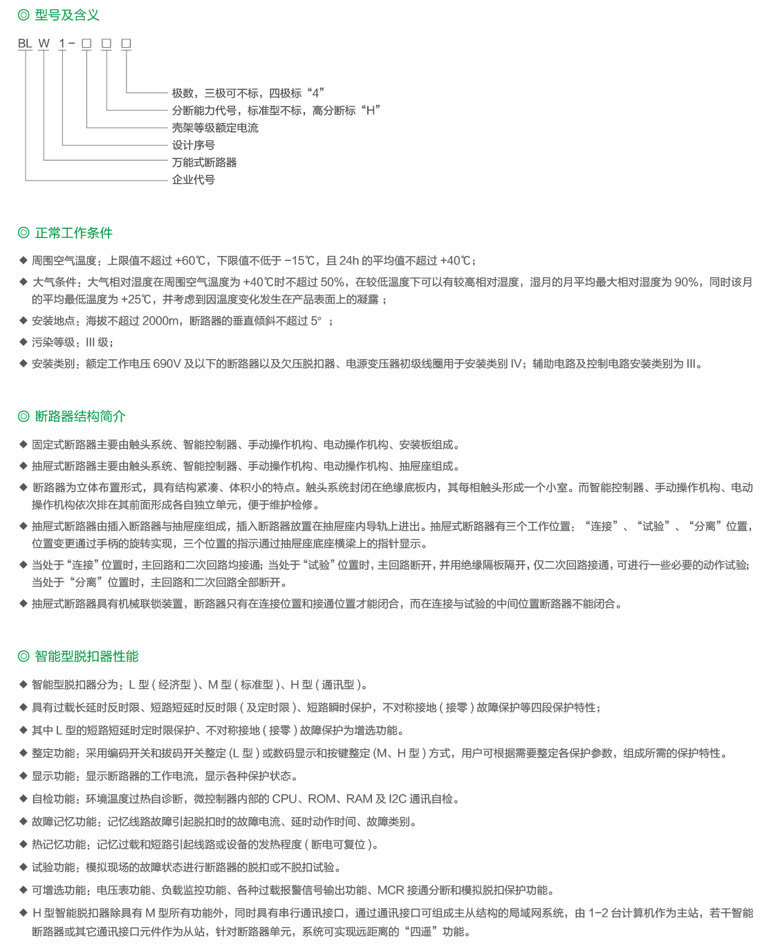 BLW1系列万能式断路器(以下简称断路器),适用于交流50Hz,额定工作电压至690V及以下,额定电流200A-6300A的配电网络中,用来分配电能和保护线路及电源设备免受过载、欠电压、短路、单相接地等故障的危害,断路器具有智能化保护功能,有较高精度的选择性保护,提高了供电可靠性。同时带有标准的RS485通讯接口,可进行“遥测”、“遥讯”、“遥控”、“遥调”四遥功能,以满足控制中心和自动化系统的要求。该系列断路器具有结构紧凑、分断能力高、无飞弧距离等特点。断路器不带智能脱扣器及传感器时可作隔离开关用,标示为 。 断路器符合GB/T14048.2《低压开关设备和控制设备低压断路器》和IEC60947-2《低压开关设备和控制设备断路器》等标准。